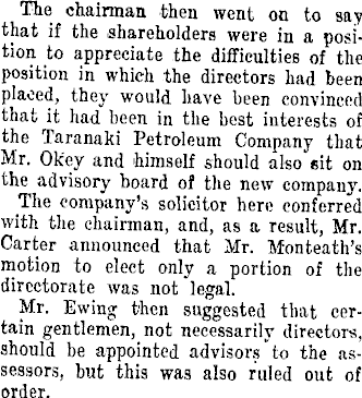 The chairman then went on to say that if the shareholders were in a position to appreciate the difficulties of the position in which the directors had been placed, they would have been convinced that it had been in the best interests of the Taranaki Petroleum Company that Mr. Ok'ey and himself should also sit on the advisory board of the new company. The company's solicitor here conferred with the chairman, and, as a result, Mr. Carter announced that Mr. Monteath's motion to elect only a portion of the directorate was not legal. Mr. Ewing then suggested that certain gentlemen, not necessarily directors, should be appointed advisors "to the assessors, but this was also ruled out of order.