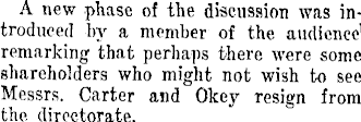A new phase of the discussion was introduced by a member of the audience' remarking that perhaps there were some shareholders who might not wish to see Messrs. Carter and Okey resign from the. directorate.