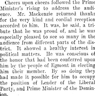 Cheers upon cheers followed the Prime Minister's rising to address the audience. Mr. Mackenzie returned thanks for the very kind and cordial reception accorded to him. It was, he said, a tribute thait he was proud of, and he was especial]}' pleased to see so many in the audience from different parts of the district. It showed a healthy interest in political matters. He was conscious of the honor that had been conferred upon him by the people of Egmont in electing him their member. By so doing they had made it possible for him to occupy the position of Leader of the Liberal Party, and Prime Minister of the Dominion.