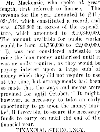 Mr. Mackenzie, who spoke at great length, first referred to finance. The revenue for the year amounted to £'ll,034,544. 'which constituted a record, and was £720,800 in excess of the expenditure, which amounted to .•£10,340.(100. The amount available for public works would be from £11,750,000 to £2,000,000. ' It was not considered advisable to raise the loan money authorised until it was actually required, as they would be paying interest upon a large sum' of money which they did not require to use at the time, but arrangements had been so made that the ways and means were provided for until October. ' It might, however, be necessary to take an early opportunity to go upon the money market, if favorable, to secure the necessary funds to carry on until the end of the financial vear. FINANCIAL STRINGENCY.