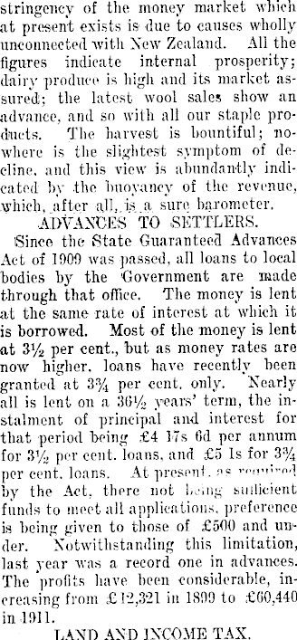 stringency of the money market which at present exists is due to causes wholly unconnected with New Zealand. All the figures indicate internal prosperity; dairy produce is high and its market assured; the latest wool sales show an advance, and so with all our staple products. The harvest is bountiful; nowhere is the slightest symptom of decline, and this view is abundantly indicated by the buoyancy of the revenue, which, after all, is a sure, barometer. ADVANCES TO SETTLERS. Since the State Guaranteed Advances Act of 1901) was passed, all loans to local bodies by the Government are made through that office. The money is lent at the same rate of interest at which it is borrowed. Most of the money is lent at 3y 2 per cent., but as money rates are now higher, loans have recently been granted at 3% per cent. only. Nearly all is lent on a 36y s years' term, the instalment of principal and interest for that period being £4 17s Od per annum for 3y 3 per cent, loans, and £5 Is for 3% per cent, loans. At present. ;>s , "n'' ;,, '"l by the Act, there not suilicient funds to meet all applications, preference is being given to those of £SOO and under. Notwithstanding this limitation, last year was a record one in advances. The profits have been considerable, increasing from £12,321 in 1800 to £80,440 in .11)11. LAND AND INCOME TAN.