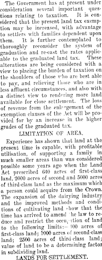The Government has at present under consideration several important questions relating to taxation. It is considered that the present land tax exemption may be increased, with advantage to settlers with families dependent upon them. It is further contemplated to thoroughly reconsider the system of graduation and re-cast the rates applicable to the graduated land tax. These alterations are being considered with a view to placing the burden of taxation on the shoulders of those who are best able to pay, and relieving those who are in less affluent circumstances, and also with a distinct view to rendering more land available for close settlement. The loss of revenue from the enlr'-gement of the exemption clauses of the Act will be provided for by an increase in the higher grades of the graduated tax. LIMITATION OF AREA. Experience lias shown that land at the present time is capable, with profitable utilisation, of supporting a family in much smaller areas than was considered possible some years ago when the Land Act prescribed 040 acres of first-class land, 2000 acres of second and 5000 acres of third-class land as the maximum which a person could acquire from the Crown. The expansion of the dairying industry and the improved methods and conditions of cultivating land show that the time has arrived to amend he law to reduce and restrict the occu, ition of land to the following limits:- W0 acres of first-class land; 1000 acres of second-class land; 2500 acres of third-class land; value of land to be a determining factor in subdividing land. LANDS FOR SETTLEMENT.