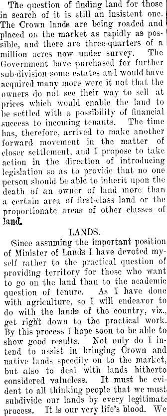 The question of finding land fox those in search of it is still an insistent one. The Crown lands are being roaded and I placed on the market as rapidly as possible, and there are three-quarters of a | million acres now under survey. The Government have purchased for further sub-division some estates an.l would have acquired many more were it not that the owners do not see their way to sell at prices which would enahle the land to be settled with a possibility of financial success to incoming tenants. The time has, therefore, arrived to make another forward movement in the matter of closer settlement, and I propose to take action in the direction of introducing legislation so as to provide that no one person should be able to inherit upon the death of an owner of land more than a certain area of Jlrst-class land or the proportionate areas of other classes of land. LANDS. Since assuming the important position of Minister of Lands I have devoted myself rather to the practical question of providing territory for those who want to go on the land' than to the academic question of tenure. As I have done with, agriculture, so I will endeavor to do with the lands of the country, viz., get right down to the practical work. By this process I hope soon to be able to sliow good results. Not only do I intend to assist in bringing Crown and native lands speedily on to the market, but also to deal with lands hitherto considered valueless. It must be evident to all thinking people that we must subdivide our lands by every legitimate process. It is- our very life's blood. We
