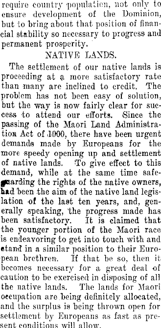 require country 'population, not only to ensure development of the Dominion, but to bring about that position of financial stability so necessary to progress and permanent prosperity. NATIVE LANDS. The settlement of our native lands is proceeding at a more satisfactory rate than many are inclined to credit. The problem has not been easy of solution, but the way is now fairly clear for success to attend our efforts. Since the passing of the Maori Land Administration Act of il!)00, there have been urgent demands made by Europeans for the more speedy opening up and settlement of native lands. To give effect to this demand, while at the same time safegaarding the rights of the native owners, had I>een the aim of the native land legislation of the last ten years, and, generally speaking, the progress made has been satisfactory. It is claimed that the younger portion of the Maori race is endeavoring to get into touch with and etanii in a similar position to their European brethren. If that be so, then it becomes necessary for a great deal of caution to be exercised in disposing of all the native lands. The lands for Maori occupation are being definitely allocated, and the surplus is being thrown open for settlement by Europeans as fast as present conditions will allow.