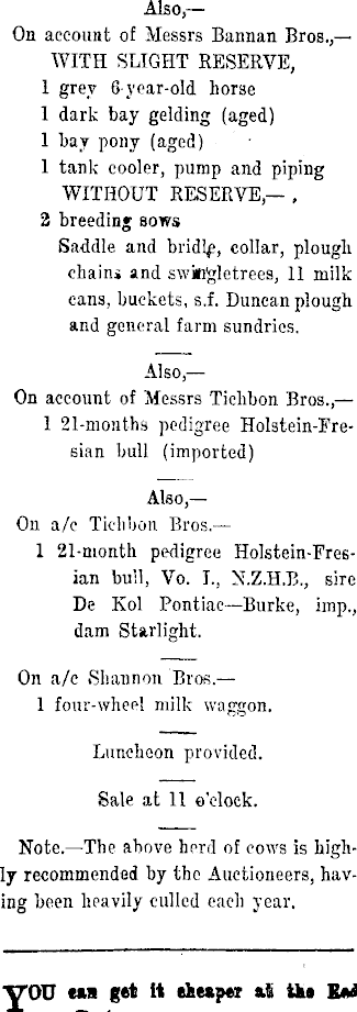 Also,— On account of Messrs Bannan Bros.,— WITH SLIGHT RESERVE, 1 grey 6-year-old horse 1 dark bay gelding (aged) 1 l)a_y pony (aged) 1 tank cooler, pump and piping WITHOUT RESERVE,— , 2 breeding sows Saddle and collar, plougli chains and swtogletrees, 11 milk cans, buckets, s.f. Duncan plough and general farm sundries. Also, — On account of Messrs Ticlibon Bros.,— 1 21-months pedigree Holstein-Fre-sian bull (imported) Also, — On a/e Ticlibon Bros. — 1 21-month pedigree Holstein-Fres-ian bull, Vo. 1., N.Z.H.8., sire De Kol Pontiac—Burke, imp., dam Starlight. On a/c Shannon Bros.— 1 four-wheel milk waggon. Luncheon provided. Sale at 11 o'clock. Note. —The above herd of cows is highly recommended by the Auctioneers, having been heavily culled each year. yOU us get It ekespw xi tfc* K*£