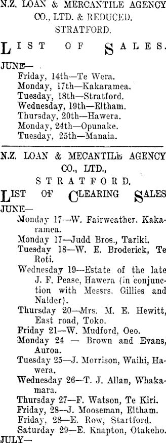 N.Z, LOAN" & MERCANTILE AGENCY CO., LTD. & REDUCED. STRATFORD. LIST OF gALES. JUNE— . Friday, 14th—Te Wera. Monday, 17 th—Kakaramea. Tuesday, 18th—Stratford. Wednesday, 19th —Eltham. Thursday, 20th—Hawera. Monday, '24th—Opunake. Tuesday, 25th—Manaia. N.Z. LOAN & MECANTILIi AGENCY CO., LTD., STRATFORD. Of QLEARING gALES JUNE— Monday 17— W. Fairweather. Kakaramea. Monday 17—Judd Bros., Tariki. Tuesday 18— W. E. Broderick, Te Roti. Wednesday 19—Estate of the late J. F. Pease, Hawera (in conjunction with Messrs. Gillies and Nalder). Thursday 20 —Airs. M. E. Hewitt, East road, Toko. Friday 21 —W. Mudford, Oeo. Monday 24 Brown and Evans, Auroa. Tuesday 25 —J. Morrison, Waihi, Hawera. Wednesday 26 T. J. Allan, Whakamara. Thursday 27 —F. Watson, Te Kiri. Friday, 28— J. Mooseman, Eltham. Friday, 28— E. Row, Startford. Saturday 29 E. Knapton, Otakeho. JULY-