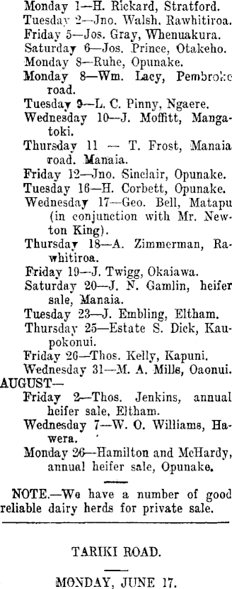 Monday I—H.1 —H. Rickard, Stratford. Tuesday 2 —Jno. Walsh, Rawhitiroa. Friday s—Jos. Gray, Whenuakura. Saturday <S—Jos. Prince, Otakeho. Monday B—Ruhe, Opunake. Monday B—Wm. Lacy, Pembroke Toad. Tuesday 9 —L. C. Pinny, Ngaere. Wednesday 10— J. Moffitt, Mangatoki. Thursday 11 T. Frost, Manaia road. Manaia. Friday 12—Jno. Sinclair, Opunake. Tuesday 16 —H. Corbett, Opunake. Wednesday 17—Geo. Bell, Matapu (in conjunction with Mr. Newton King). Thursday 18—A. Zimmerman, Rawhitiroa. Friday 19— J. Twigg, Okaiawa. Saturday 20 —J. N. Gamlin, heifer sale, Manaia. Tuesday 23 J. Embling, Eltham. Thursday 25—Estate S. Dick, Kaupokonui. Friday 26—Thos. Kelly, Kapuni. Wednesday 31—M. A. Mills, Oaonui. AUGUSTFriday a—-Thos. Jenkins, annual heifer sale, Eltham. Wednesday 7 —W. 0. Williams, Hawera. Monday 26—Hamilton and McHardy, annual heifer sale, Opunake. NOTE.—Wa have a number of good reliable dairy herds for private sale. TARIKI ROAD. MONDAY, JUNE 17.