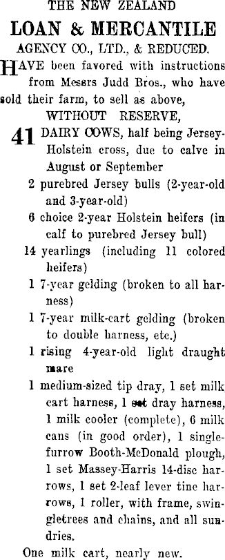 THE NEW ZEALAND LOAN & MERCANTILE AGENCY 00., LTD., & REDUCED. JJAVE been favored with instructions from Messrs Judd Bros., who have sold their farm, to sell as above, WITHOUT RESERVE, DAIRY OOWS, half being JerseyHolstein cross, due to calve in August or September 2 purebred Jersey bulls (2-year-old and 3-year-old) 6 choice 2-year Holstein heifera (in calf to purebred Jersey bull) 14 yearlings (including 11 colored heifers) 1 7-year gelding (broken to all harness) 1 7-year milk-cart gelding (broken to double harness, etc.) 1 rising 4-year-old light draught mare 1 medium-sized tip dray, 1 set milk cart harness, 1 s«t dray harness, 1 milk cooler (complete), 6 milk cans (in good order), 1 singlefurrow Booth-McDonald plough, 1 set Massey-Harris 14-disc harrows, 1 set 2-leaf lever tine harrows, 1 roller, with frame, swingletrees and chains, and all sundries. One milk cart, nearly new.