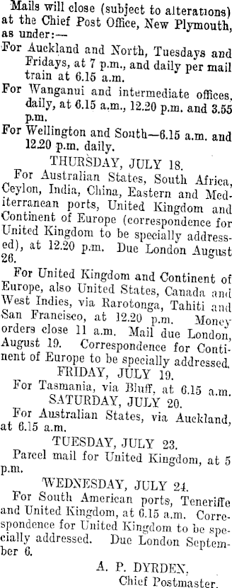 Mails will close (subject to alterations) at the Chief Post Office, New Plymouth, as under:— For Auckland and North, Tuesdays and Fridays, at 7 p.m., and daily per mail tram at 6.15 a.m. For Wanganui and intermediate offices, daily, at 6.15 a.m., 12.20 p.m. and 3.55 p.m. For Wellington and South—6.ls a.m. and 12.20 p.m. daily. THURSDAY, JULY 18 For Australian States, South Africa, Ceylon, India, China, Eastern and Mediterranean ports, United Kingdom and yontment of Europe (correspondence for United Kingdom to be specially addressed), at 12.-0 p.m. Due London August For United Kingdom and Continent of Europe, also United States, Canada and West Indies, via Rarotonga, Tahiti and San Francisco, at 12.20 p.m. Monev orders close 11 a.m. Mail due London, August 19. Correspondence for Continent of Europe to be specially addressed, FRIDAY, JULY 19. For Tasmania, via Bluff, at 6.15 am SATURDAY, JULY 20. For Australian States, via Auckland at 6.15 a.m. ' TUESDAY, JULY 23. Parcel mail for United Kingdom, at 5, p.m. WEDNESDAY, JULY 24. For South American ports, Teneriffe and United Kingdom, at 0.15 a.m. Correspondence for United Kingdom to be specially addressed. Due London September 6. A. P. DYRDEN. Chief Postmaster.