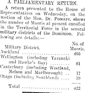 A PARLIAMENTARY RETURN. A return presented to the House of Keprescnta-tives on Wednesday, on the motion of the Hon. Dr. Pomarc, shows the numbw of Maoris a-t present enrolled m the Territorial Force in the several military districts of the Dominion. Following are details: ~...., No. of Military District. Maoris Auckland 403 Wellington (including Taranaki and IJavvke's Bav) 81 Canterbury (including Westland, Nelson and Mavlborough) .. 17 Otago (including Southland) .... 1!) Total
