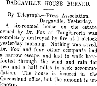 DARGAVILLE HOUSE BURNED. By Telegraph.—Press Association. Dargaville, Yesterday. A six-roomed house on the estate owned by Dr. Fox at Tangitiroria was completely destroyed by fire at 1 o'clock yesterday morning. Nothing was saved, Dr. Fox and four other occupants had a narrow escape, and had to walk barefooted through the wind and rain for two and a half miles to seek accommodation. The house is insured in the Queensland office, but the amount is unknown.