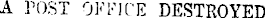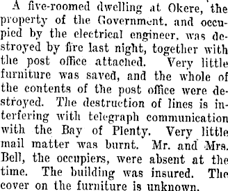 A five-roomed dwelling at Okere, the property of the Government, and occupied by the electrical engineer, was destroyed by lire last night, together with the post office .attached. Very little furniture was saved, and the whole of the contents of the post office were de-j stroyed. The destruction of lines is interfering with telegraph communication with the Bay of Plenty. Very little mail matter -was burnt. Mr. and" Mrs. Bell, the occupiers, were absent at the time. The building was insured. The cover on the furniture is unknown.