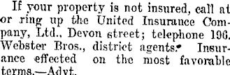 If your property is not insured, call at or ring up the United Insurance Company, Ltd., Devon street; telephone 190. Webster Bros., district agents* Insurance effected on the most favorable terms.—Advt.