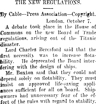 THE NEW REGULATIONS. By Cable —Press Association—Copyright. London. October 7. A debate took place in the House of Commons on the new Board of Trade regulations, arising out of the Titanic disaster. •Lord Charles Bercsford said that the first necessity was to increase notability. He deprecated the Hoard interfering with the design of ships. Mr. Buxton said that they could not depend .solely on flotnbility. They must insist on approved life-saving appliances sufficient for all on 'board. Ship■owners had unnecessary fear of the effect of the rules with regard to stability.