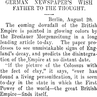 GERMAN NEWSPAPER'S WISH FATHER TO THE THOUGHT. Berlin, August 20. The coming downfall of the British Empire is painted in glowing colors by the Breslauer Morgenzeitung in a long leading article to-day. The paper professes to see unmistakable signs of England's decay, and predicts the disintegration of the .Empire at no distant date. "if the picture of the Colossus with the feet of clay," it says, "ever has found a living personification, it is seen to-day in the state in which the First Power of the great British Empire—finds itself.