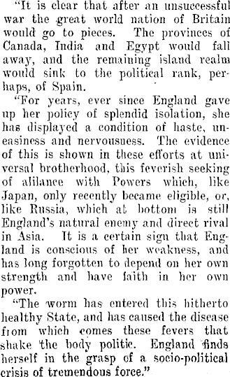 i "It is clear that after an unsuccessful war the great world nation of Britain would go to pieces. The provinces of Canada, India and Egypt would fall away, and the remaining island realm would sink to the political rank, perhaps, of Spain. "For years, ever since England gave up her policy of splendid isolation, she has displayed a condition of haste, uneasiness and nervousuess. The evidence of this is shown in these efforts at universal brotherhood, this feverish seeking of alliance with Powers which, like Japan, only recently became eligible, or, like Russia, which at bottom is still England's natural enemy and direct rival in Asia. It is a certain sign that England is conscious of her weakness, and has long forgotten to depend on her own strength and have faith in her own power. "The worm has entered this hitherto healthy State, and has caused the disease fiom which comes these fevers that shake the body politic. England finds herself in the grasp of a socio-political crisis of tremendous force."