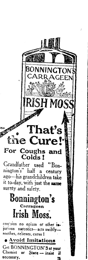 bonnington: CARRAGEENI \IW. For Coughs and Colds! Grandfather used "Bonnington's" half a century ago—his grandchildren take it to-day, with just the tame surety and safety, Boanington's Carrageen Irish Moss. cotpins no opium or other iajurious narcotics—acts swiftly soothes, relieves, cures I • Avoid Imitations Get BONNINGTON'Satyour Chemist or Store insist if necessary, n