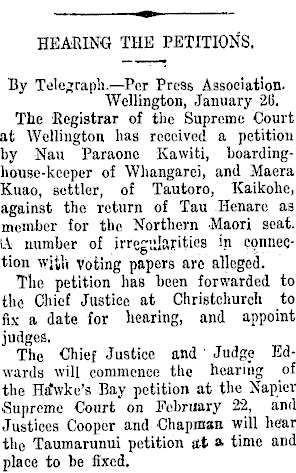HEARING THE PETITIONS. By Telegraph.—Per Press Association. Wellington, January 26. The Registrar of the Supreme Court at Wellington has received a petition by Nau Paraone Kawiti, boarding-house-keeper of Whangarci, and Maera Kuao, settler, of Tautoro, Kaikohe, against the return of Tau Henare as J member for the Northern Maori seat. IA number of irregularities in connection •\yjtVi voting papers arc alleged. The petition has been forwarded to the Chief Justice at Christchurch to fix a date for hearing, and appoint judges. , The Chief Justice and ' Judge Edwards will commence the hearing of the Mwke's Bay petition at the Napier Supreme €ourt on February 22, and Justices Cooper and Chapman will hear the Taumarunui petition st-t a time and place to be fixed.