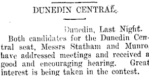 DUNEDIN CENTRA!^. Ouuedin, Last Night. Both candidates for the Dunedin Central seat, Messrs Statham and Munro, have addressed meetings and received a good and encouraging hearing. Great interest is being taken in the contest.