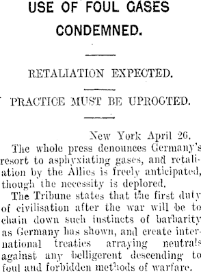 USE OF FOUL GASES CONDEMNED. RETALIATION EXPECTED. ' PRACTICE MUST BE UPROOTED. New York April 20. The whole press denounces Germany's resort to asphyxiating gases, and retaliation by the Allies is freely anticipated, 1 though the necessity is deplored. The Tribune states that tlie first duty of civilisation after the war will be to chain down such instincts of barbarity as Germany has shown, and create international treaties arraying neutrals against any belligerent descending to foul and forbidden methods of warfare.