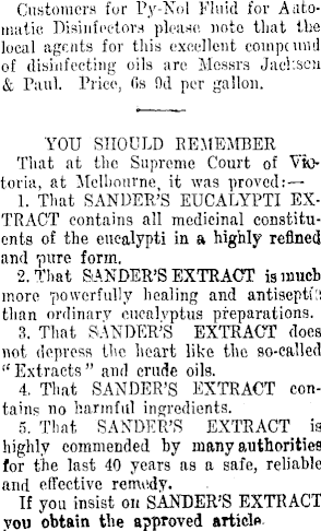Customers for Py-Nol Fluid for Automatic Disinfcetors please, note that the local agents for this excellent coinpnnul of disinfecting oils are Messrs Jacl:son & Paul. Price, (is Od per gallon. YOU SHOULD REMEMBER That at the Supreme Court of Victoria, at Melbourne, it was proved:— 1. That SANDER'S EUCALYPTI EXTRACT contains all medicinal constituents of the eucalypti in a highly refined and pure form. 2. That SANDER'S EXTRACT is much more powerfully healing and antiseptic than ordinary eucalyptus preparations. 3. That SANDER'S EXTRACT does not depress the heart like the so-called "Extracts" and crude oils. 4. That SANDER'S EXTRACT contains no harmful ingredients. 5. That SANDER'S EXTRACT is highly commended by many authorities for the last 40 years as a safe, reliable and effective remedy. If you insist on SANDER'S EXTRACT you obtain the approved articlo.