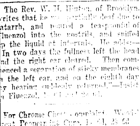 The Rev. W. 7T. TF'nf-.rs. of Tiroo'ilyn. 'rites that he ".'t.;:!!'■* <V'if 'm l to itarrh, am! p-awil s> tc:i-p niu'iil of Inenzol into the rnstriK rind ?mi"cl 7) the liquid ft jn'-mK Ho In two days the fnllne*? left tinTill the ric;ht f" clcirf'!. Then eo?nler.eed a scprrntion <»f sfWcy membranes 1 the left ear. «ari <ni the eighth day !7 henrin" v !rviv-I." —Twf Fuif;:;v!. ' '' i ■' ' ' 1 •• Frrr Chrome Ci:< ! ' . t Tryicir. : .:A- H:r\ J - '•!, -■> '«