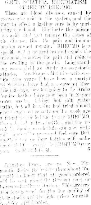 COLT. SCIATICA. liHKITMATISM f ■I'llKI) W iillKl'MO. These air Mootl diseases, canned l>y a\i<'r--. wv'.r acid in tllr and tin? wwy to cliVcJ. a ]us|i»«r <'urc is by 'piiri- }- \ws t!n« 1 jl. Kiim'uatc tlh- poisonII•. ;ni;l :?;■.! \<,n reino\o flir uf ;In* dii '/a-i-. tli;i ■ V.iv pain and inilaminaliui TJIIKIWIO is a .-jK'-iji;- nli ; is la.'iiiralises and expels tin' nrie and. removes Hie pain and minces fite j:\vtdliiiL' at tlio joints. Lonu-staml-i»i (vi: c.-i \iild as s-'indv as (u-'.-a< ional ; ; t.taci->. Mr. F'a»"is Mi-Ckln- writes:ivo year-; i liave Ir'en a martyr to Siii'iir.i. 1 i;i V..id. a '/nurse of Vdeafrit- iiNV- a-jc. '" 1 -!i]i'S f^ciito 11 1 Ai'olia for ti:r ka\v w.iw keen in Xapiev seven uetl.-, i■'H'!' hoi, salt water katk-a !m{'. a!l in vai>': kad tried almost rvi'V •"!"< <'d i' dy iiMiil a week ap'o ;! ' v ')'■ i::'dfd me i I'.v IMIRPMO. ■|'V!' 'ia 1 a> IWo ladik-. aad (lie r l - Jatu 1 : \<> i<l£ ."i'n]: <-an v.ow walk' ...j- 1 •* ')•< <■:' "- 1 a'a- 1 li'i'l ve tkat. ■ m:,,<-p m]' mi!!" ka-tle- will make .... M ■ ,v, lad 'IHWMO clt'-f u, !. -2* < : d a:id !-. Hi!. H ,kdia.-d on ar.! ;,|, r .v""' 11>nnuitii. dc-liv ("!;«' ralZ: • Mirunakonf Ta-]-aaal iin know tliaf ?.H foods ordered ;i] | 1( , M'* { i-'vi'di <>r rail Ti.U irroeery U v ..»a -.vu-1 for {]•>> liui- quality of ,• ~: j • ' , a ad (!-.■ li-M' for cask, :Va '• a