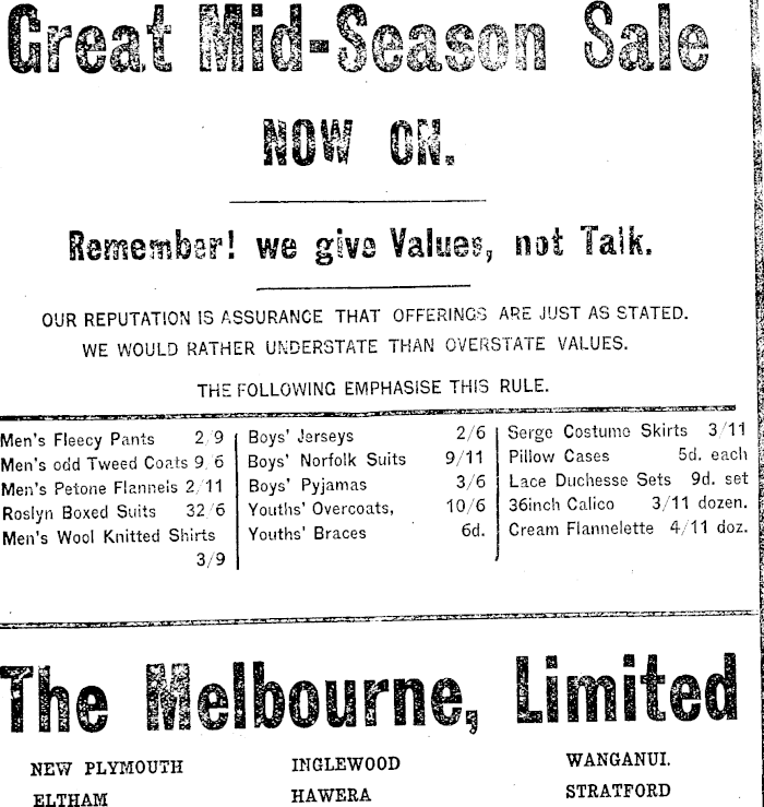 Remember! we gsva Values, nat Taik. OUR REPUTATION IS ASSURANCE THAT OFFERINGS ARE JUST AS STATED. WE WOULD RATHER UNDERSTATE THAN OVERSTATE VALUES. THE FOLLOWING EMPHASISE THIS RULE. Men's Fleecy Pants 2 9 Men's odd Tweed Coats 9, 6 Men's Petone Flannels 2/11 Roslyn Boxed Suits 32 '6 Men's Wool Knitted Shirts 3/9 Serge Costumo Skirts 3/11 Pillow Cases sd. each Lace Duchesse Sets 9d. set 36inch Calico 3/11 dozen. Cream Flannelette 4/11 doz. NEW PLYMOUTH ELTHAM INGLEWOOD HAWERA Limited WANGANUI. STRATFORD