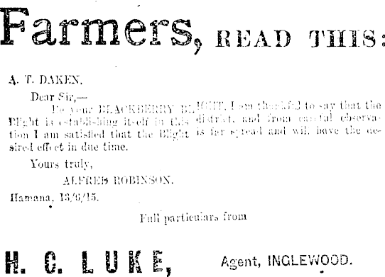 Farmers, read this: -V T. DAKKN. Dear fir,— , riVit i.t sl*v!i i:.:s rcts.i'ul ti-m lam satirJii-il that t'u l U'.Sgttt '* i£,r K r, ' a- ' ' w%c t,,c i;i " siri'.l uir. ft ill (!uo ti:nc. Yours truly, AMTIKH HOBINSnX. Ilamana. lo.'lj/!5. rail particuiaro from H. 0. LUKE, Agent, INGLEWOQD.
