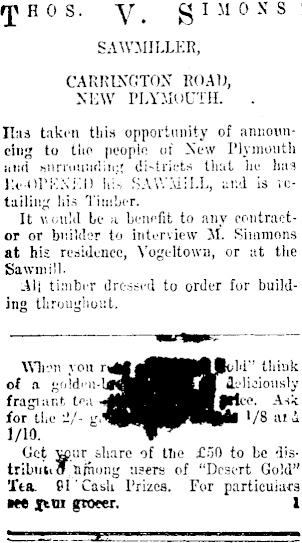 Ip H 0 S. y. gIM 0 X S SAWMII.LER, CARKLXGTON HOAt), m;w Plymouth. . Ilaa taken this opportunity of announcing to the people of New Plymouth iiiiii hnrrnunfiiir.; di-triets that he has I't- hi-, SAWMILL, ar.d is retailing his Timber. It ttouM be a benefit to any contractor or builder to interview 31. Simmons at his residence, Vogeltown, or at the Sawmill. All timber dressed to order for building throughout. Wln'ii you think 1 of a ielieiously fragiur.t tea frtee. Ask' Get «jur_ share of the £3O to be d>stribtiiifT among u=ers of "Desert Gold" Tea 61' Cash Prizes. For particulars Mt Jtoi gtoeer. 1