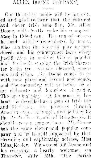 ALUi.V IKIMXK ai.MI'AXV. Our i!i'M( rji_M 1 pnlilie will !'» intere-f. cd and "lad to liear Unit the cultured ard clever !ri-Ii comedian. Mr. Allen Doone. v,il! r-!i'irl!y uijikc Itis p -appearance in town. 'J'li.■ rim of Minns* lie mad- will 1" re;iM'i:ilj!-ru't liv in.ie-.. \vlii> admired iii-' slyie ui play le- produced. and his countrymen Iwvr every ;i in simUhix him a popular idi.l. fi-r -{•ijriisjf the Trisli rktrsster in iin t;'i:. nnei*. elevated, evi!-r----ous and clean. Uaone cumc- 1 u uivitli i!e',v plays and several new »ou':s. and t!i" tiKiaanrir will a-. before hj" el an cieberal-' and luxurious < h-<raider. The oj - -sin-j- play "A Koiuawe in Ireland.' is tle-erihed as a ucin ot h'i-1' lii" and !ile-\-t';ilts prepress UiroiuU Ami-rifi ;.•«< a tnmiijiii, »i:«l jmtuiujr the ru ol d of its :-:ie,-ss. it .KlioiiU |-r. •>' i< ;::a;.:iiet here. Mr. Ifoi-ac has the s:i]jii> clover and popular coru.pany au-'l ll'.* is still supported by tint tlnrnii-' ;' and captivating actress, Miss Edna.Keoley. Wo extend Mr Donne and his cfttipany a hearty welcome, on Thtii'fdv'. ,Tiilv 15th, "The Parish