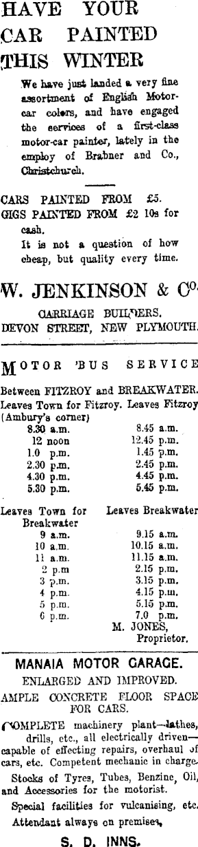 HAVE YOUR CAR PAINTED THIS WINTER We have just landed a very fine assortment of English Motorcar cohws, and have engaged the eervioes of a first-class motor-car painter, lately in tie employ of Brabner and Co., dsristc&iu'eh. CARS PAINTED FROM £5GIGS PAINTED FROM £2 10a for cash. It is not a question of how cheap, but quality every time. W. JENKINSON & 0° OABRIAGE BUHNERS. DEVON STREET, NEW PLYMOUTH. \fOTOK 'BUS SERVICE Between FITZROY and BREAKWATER. Leaves Town for Fitzroy. Leaves Fitzroy (Ambury's corner) 8.30 a.m. 8.45 a.m. 12 noon 12.45 p.m. 1.0 p.m. 1.45 p.m. 2.30 pjn. 2.45 p.m. 4.30 p.m. 4.45 p.m. 5.30 p.m. 5.45 p.m. Leaves Town for Leaves Breakwater Breakwater 9 a.m. 10 a.m. 11 a.m. 2 p.m 3 p.m. 4 p.m. 5 p.m. C p.m. 9.15 a.m. 10.15 a.m. 11.15 a.m. 2.15 p.m. 3.15 p.m. 4.15 p.m. 5.15 p.m. 7.0 p.m. M. JONES, Proprietor. MANAIA MOTOR GARAGE. ENLARGED AND IMPROVED. AMPLE CONCRETE FLOOR SPACE FOR CARS. POMPLETE machinery plant—lathes, drills, etc., all electrically driven—capable of effecting repairs, overhaul of cars, etc. Competent mechanic in charge. Stocks of Tyrea, Tubes, Benzine, Oil, and Accessories for the motorist. Special facilities for vulcanising, etc. Attendant always on premises S. D. INNS.