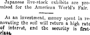 Japanese live-stock exhibits are promised for the American World's Fair. As an investment, money spent in renovating the soil will return a high rate of interest, end tbe security ia firstdas*.
