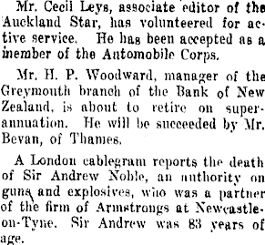 Mr. Cecil Leys, associate editor of the Auckland Star, has volunteered for active service. He lieb been accepted as a member of the Automobile Corps. Mr. H. P. Woodward, manager of the Greyraoiith branch of the Bank of New Zealand, is about to retire on superannuation. He will be succeeded by Mr. Bevan, of Thames, A London cablegram reports the death of Sir Andrew Noble, an authority on explosives, who was a partner of the firm of Armstrongs at Newcastle-on-Tyne. Sir Andrew was 83 years of age.