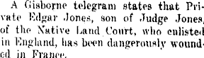 A Gisborne telegram states that Private Edgar .Jones, son of Judge Jones, of the Xative Land Court, who enlisted in England, lias been dangerously wounded in France.
