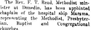 The Rev. F. T. Bead, Methodist minister at Duimdin, has been appbint»4 chaplain of the hospital ship Margins,, representing the Methodist, Presbyterian. Baptist and Congregational . churches.