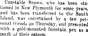 Constable Brown, who has been stationed in Xew Plymouth for some years, and has been transferred to the South Tshind, was entertained by a few personal friends on Thursday, and presented with a gold-mounted fountain pen as a mark of their esteem.