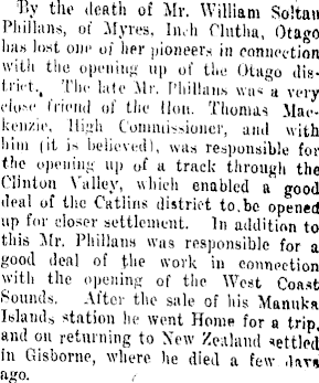 By the death of Mr. William Soltan Phillans, of Myres, huh Clutha, Otago has lost one of her pioneers in connection with the opening up of the Otago district., The late Mr. Phillans wu« a very chre friend of the lion. Thomas Mackenzie, lli;:h Commissioner, and with him (it is believed), was responsible for the opening up of a track through the Clinton Valley, which enabled a good deal of the Catlins district to.be opened up for closer settlement. In addition to this Mr. Phillans was responsible for a good deal of the work in connection with the opening of the West Coast Sounds. After the sale of his Manuka Islands station lie went Home for a trip, and on returning to Xew Zealand settled in Gisborne, where he died a few ,Ht« ago. ,