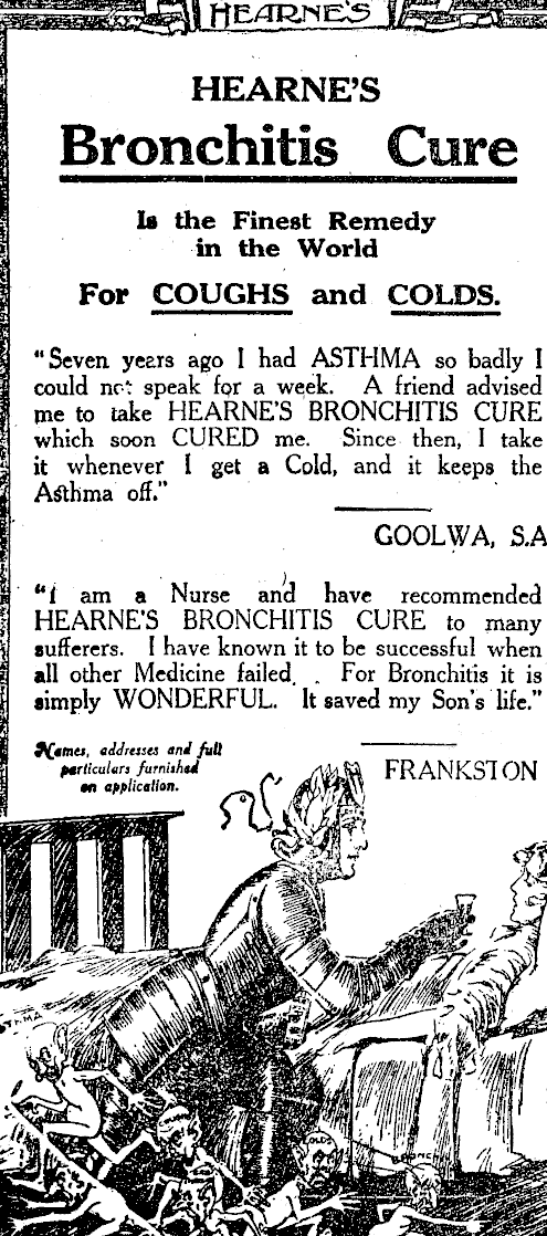 HEARNE'S Bronchitis Cure Is the Finest Remedy in the World For COUGHS and COLDS. "Seven years ago I had ASTHMA so badly I could nc* speak fpr a week. A friend advised me to lake HEARNE'S BRONCHITIS CURE which soon CURED me. Since then, I take it whenever I get a Cold, and it keeps the Asthma off." ■ GOOLWA, S.A. "t am a Nurse and have recommended HEARNE'S BRONCHITIS CURE to many sufferers. I have known it to be successful when all other Medicine failed. . For Bronchitis it is simply WONDERFUL. It saved my Son's life." 9C*uie». addresses and full
