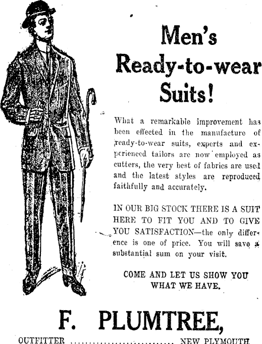 Men's Ready-to-wear Suits! What a remarkable improvement has been effected in the manufacture of jready-to-wear suits, experts and experienced tailors are now' employed as cutters, the very best of fabrics are used and the latest styles are reproduced faithfully and accurately. IN OUR BIG STOCK THERE IS A SUIT, HERE TO FIT YOU AND TO GIVE • SATISFACTION—the only differ, ence is one of price. You will save a substantial sum on your visit. COME AND LET US SHOW YOU WHAT WE HAVE. PLUMTREE, NEW PLYMOUTH