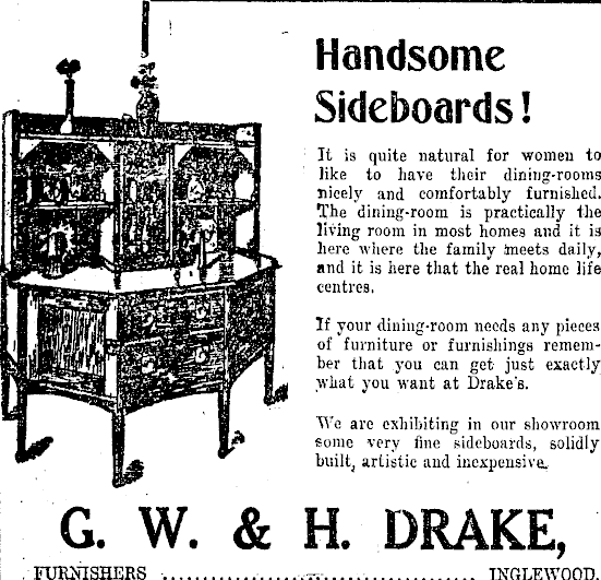 Handsome Sideboards! It is quite natural for women to like to have thoir dining-rooms nicely and comfortably furnished. The dining-room is practically the living room in most homes and it i 3 here where the family taeets daily, and it is here that the real home life centres, If your dining-room needs any pieces of furniture or furnishings remember that you can get just exactly what you want at Drake's. We are exhibiting in our showroom some very fine sideboards, solidly builtj artistic and inexpensive. G. W. & H. DRAKE, FURNISHERS ,rr INGLEWOOD.