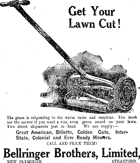 Get Your Lawn Cut! The grass is responding to the warm rains and sunshine. You must use the mower if you want a nice, even, green sward on your lawn. Two direct shipments just to hand We can ■ supply : Great American, Stiletto, Golden Gate, Inter* State, Colonial and Ever Ready Movers. CALL AND PRICE THEM! Bellringer Brothers, Limited, NEW PLYMOUTH