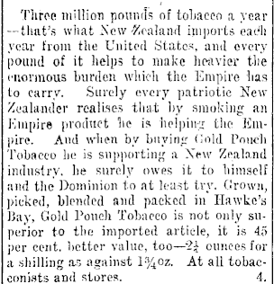 Throe million pounds of toliaeco a year that's what New -Zealand imports eac'h year from the United States, ami every pound of it helps to make heavier the enormous burden which the Empire lias to carry. Surely every patriotic New Xcalander realises that by smoking an Kinpire product he is helping the Empire. And when by bityin.tr <jold Pouc'h Tobacco lie is supporting a Xew Zealand industry, he surely owes it to himself and the Dominion to at least try. Grown, picked, blended and packed in Hawke's Bay, Gold Pouch Tobacco is not only superior to tiie imported article, it is 45 per cent, better value, too—ounces for a shilling as against l%oz. At all tobacconists and stores. 4.