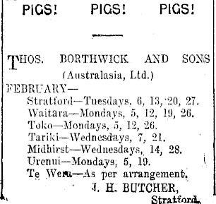 PiGS! PIGS! PIGS! ■pi-ios. BORTHWICK AND SONS (Australasia, Ltd.) FEBRUARY — Stratford—Tuesdays, 6, 13/20, 27. Waitara—Mondays, 5, 12, 19, 2G. Toko —Mondays, a, 12, 20. Tariki—Wednesdays, 7, 21. Midhirst —Wednesdays,, 14, 2S. Urenui—Mondays, 5, 19. A Te We Hi —As per arrangement. ' i. H. BUTCHER, " 11 Stratford*