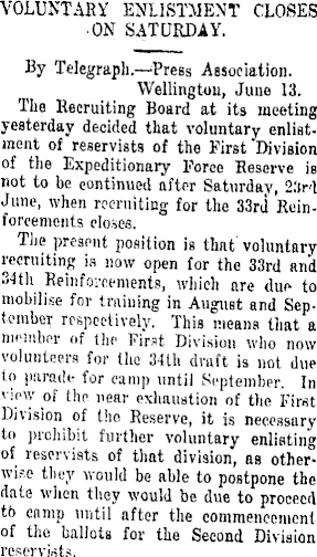 VOLUNTARY ENLISTMENT CLOSES •ON SATURDAY. By Telegraph.—Press Association. Wellington, June 13. The Hecruiting Board at its meeting yesterday decided that voluntary enlistment of reservists of the First Division of the Expeditionary Force Reserve is not to be continued after Saturday, 2:trl June, when recruiting for the 33rd Reinforcements closes. The present position is that voluntary recruiting ia now open for the 33rd and 34th Reinforcements, which are due to mobilise for training in August and September respectively. This means that a member of the First Division who now volunteers for the 34th draft is not due to parade for camp until September. In view of the. near exhaustion of the First Division of the Reserve, it is necessary to prohibit further voluntary enlisting of reservists of that division, as otherwise they would be able to postpone the date when they would be due to proceed tb camp until after the commencement of the ballots for the Second Division reservists.