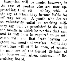 Exception will be made, however, in the case of youths who are now approaching' their 20th birthday, which is the age at which they become liaole for military service. A youth who desires to voluntarily enlist on reaching military age will be permitted to do so in the month in which he reaches that age, and he will then be required to go into camp with the first draft leaving his one month thereafter. Voluntary recruiting will still be open, of course, tn members of the Second Division of the Reserve.—J. Allen, chairman of Recruiting Board.