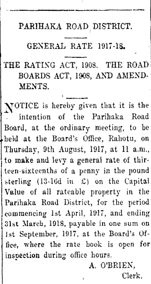 PARIHAKA ROAD DISTRICT. GENERAL RATE 1917-IS. THE RATING ACT, 1908. THE ROAD BOARDS ACT, 1908, AND AMENDMENTS. VOTICE is hereby given that it is the intention of the Parihaka Road Board, at the ordinary meeting, to be ..held at the Board's Office, Rahotu, on Thursday, 9th August, 191", at 11 a.m., to make and levy a general rate of thir-teen-sixteenths of a penny in the pound sterling (13-lCd in £) on the Capital Value of all rateable property in the Parihaka Road District, for the period commencing Ist April, 1917, and ending 31st March, 1918, payable in one sui Ist September, 1917, at the Board's uifice, where the rate book is open for inspection during office hours. A. O'BRIEN, Clerk.