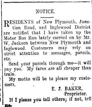 "RESIDENTS of New Plymouth, Junetion Road, and Inglewood District are notified that I have taken up the Motor Bus Run lately carried on by Mr. r W. Jackson between New Plymouth and , Inglewood. Customers may rely on strict attention to messages, parcels, etc. Send your parcels through me—it will . pay you. My fares are all cheaper than train. e My motto will be to please my custot mew. , • I t E. J. BAKER, t 'Proprietor, i If I please job tell others; if not, tell