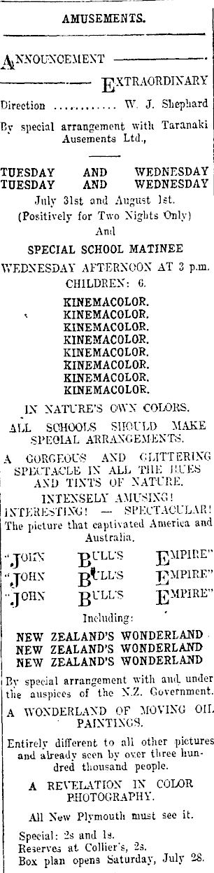 AMUSEMENTS. - "J7XTRAQRDIXARY Direction W. J. Shephard By special arrangement with Taranaki Ausements Ltd., TUESDAY AND WEDNESDAY TUESDAY AND WEDNESDAY July 31st and August Ist. (Positively for Two Nights Only) SPECIAL SCHOOL MATINEE WEDNESDAY AFTERNOON AT 3 p.m. CHILDREN: G. KINEMACOLOR. KINEMACOLOR. KINEMACOLOR. KINEMACOLOR. KINEMACOLOR. t KINEMACOLOR. KINEMACOLOR. 1 KINEMACOLOR. IN NATURE'S OWN COLORS. ALL SCHOOLS SHOULD MAKE SPEOIAL ARRANGEMENTS. A GORGEOUS AND GLITTERING SPECTACLE IN ALL THE RUES AND TINTS OF NATURE. :LY AMUSING! INTERESTING! - SPECTACULAR! The picture that captivated America and Australia. -JOHN- "BULL'S £MPIRE" jI'LL'S T?MPIRE" T7MPIRE" -piMPIRE" ■pjMPIRE" NEW ZEALAND'S WONDERLAND NEW ZEALAND'S WONDERLAND NEW ZEALAND'S WONDERLAND Bv special arrangement with and under tile auspices of the N.Z. Government. A WONDERLAND OF MOVING OIL PAINTINGS. Entirely different to all other pictures and already seen by over three hundred thousand people. A REVELATION IN COLOR PHOTOGRAPHY. All New Plymouth must see it. Special: 2s and la. Reserves at Collier's, 2s. Box plan opens Saturday, July 28.