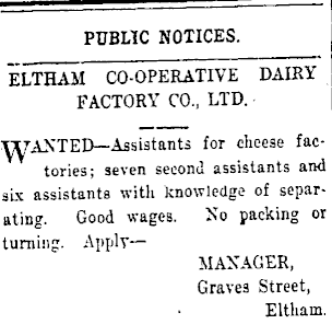 PUBLIC NOTICES. ' ELTHAM CO-OPERATIVE DAIRY FACTORY CO., LTD. f WANTED—Assistants for cheese factories; seven second assistants and six assistants with knowledge of separating. Good wages. No packing 01 turning. Applv— MANAGER, Graves Street, Eltham.